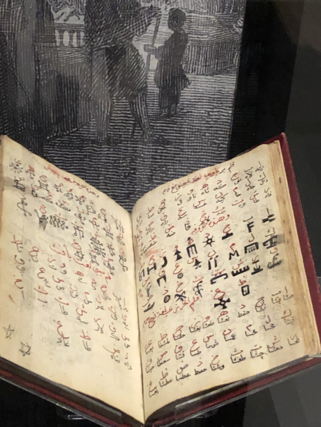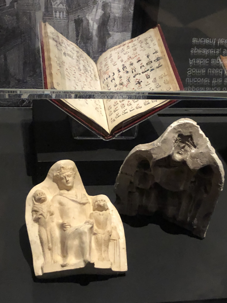 The book displayed above the statue of Hermes Trismegistos is an Islamic manuscript of various magical scripts, opened on - the label says - the script of Enoch (tradition identifies Enoch and Idris with Hermes Trismegistos). The label further says that Muslims used pseudo-hieroglyphs as magical alphabets.