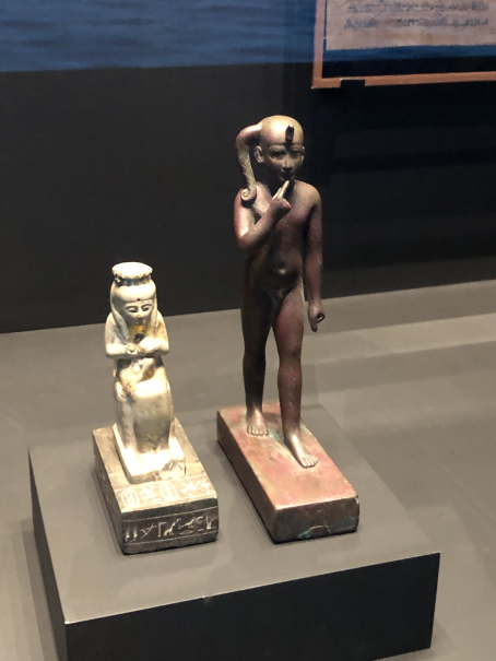 Lastly, Isis breastfeeding Horus, and Horus-the-child (forelock, finger in the mouth are both signifiers of childhood) who became hellenised as Harpocrates (from Heru-pa-khered, Horus-the-child), the god of silence. He shows up in Greek Magical Papyri.