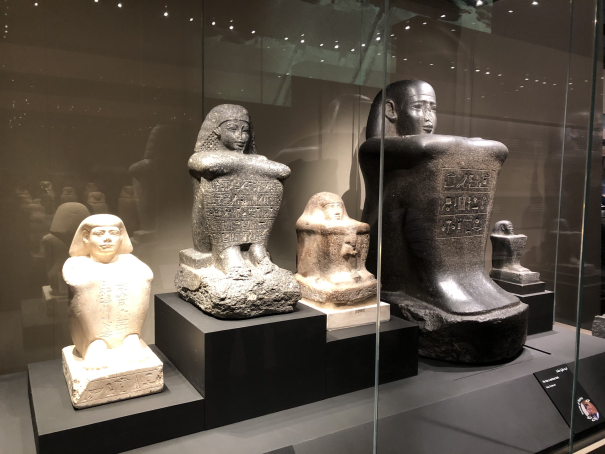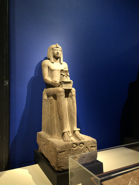 The exhibit label says that this was one of typical postures for non-royal sculptures, frequently copied after 1900 BCE. Some guy sits on the ground, hugs his knees and is wrapped in a cloak. Relatable.