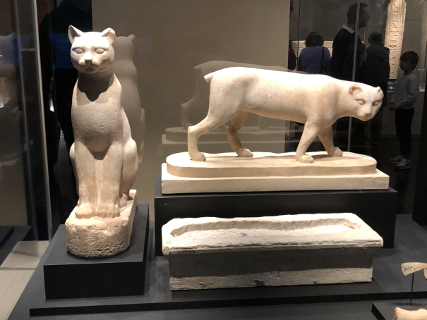 This one is for the cat lovers! The sculptures are an offering from a Greek woman left in the temple of Bubastis. One of the cats is portrayed in the typical Egyptian style and one in the more realistic Greek style.